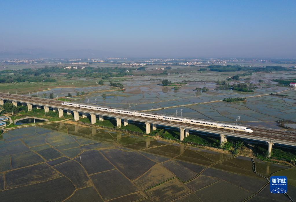 一列動車組列車在廣西南寧市賓陽縣古辣鎮的田野上行駛(4月4日攝,無人機照片)。