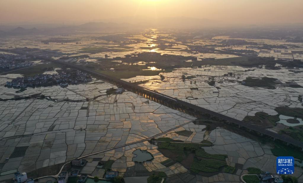 一列動車組列車在廣西南寧市賓陽縣古辣鎮的田野上行駛(4月4日攝,無人機照片)。
