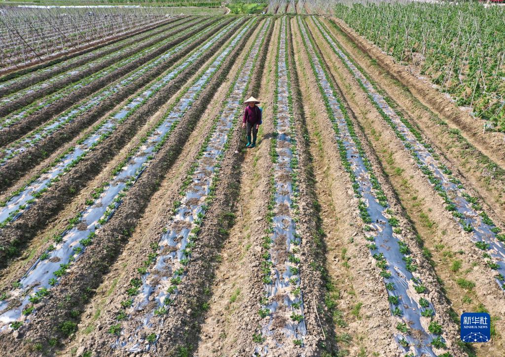 4月6日,村民在廣西南寧市興寧區五塘鎮的田間管護作物(無人機照片)。