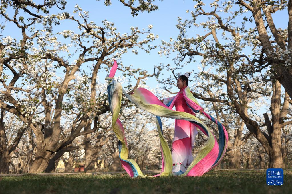 4月7日,景區工作人員在百年梨園的古樹下表演。