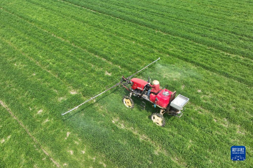4月7日,在江蘇省淮安市洪澤區三河鎮,農民駕駛農機在麥田里作業(無人機照片)。