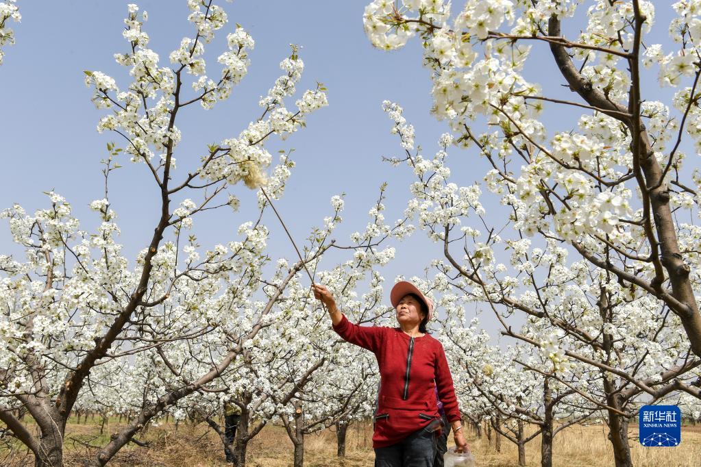 4月10日,山西省晉中市平遙縣襄垣鄉襄垣村果農在梨園內為梨花授粉。