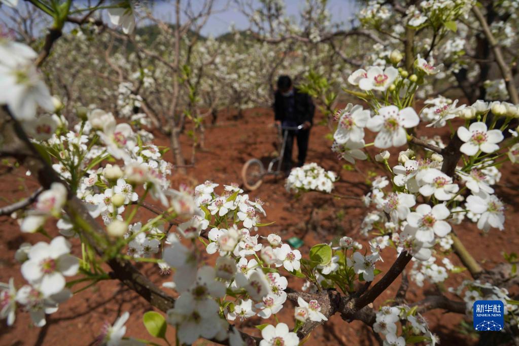 4月12日,農民在河北唐山遵化市娘娘莊鄉蘆各寨北山村的梨樹果園進行松土。