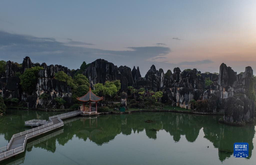 這是4月9日拍攝的石林日落景觀(無人機照片)。
