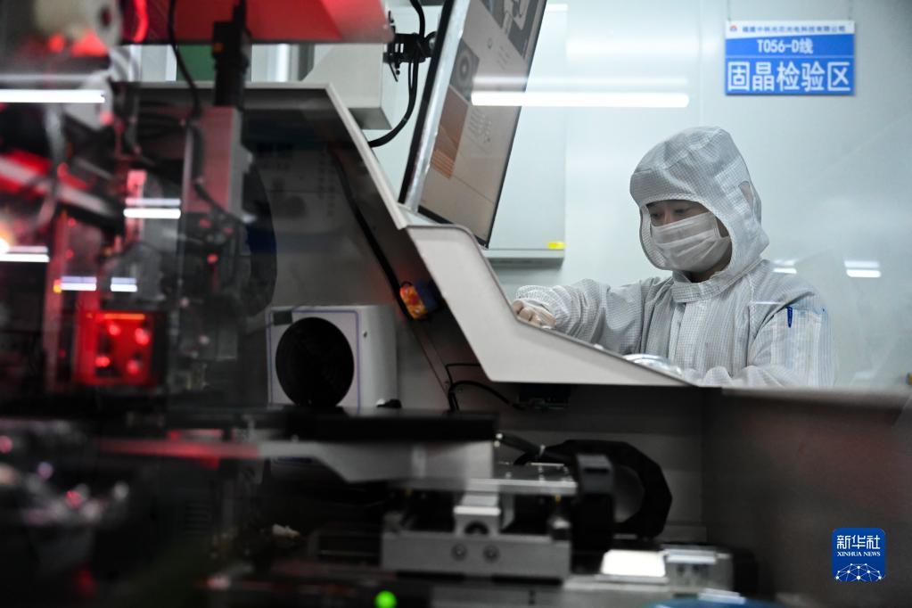4月12日,在福建泉州石獅市的一家光芯片生產企業,技術工人在車間里忙碌。