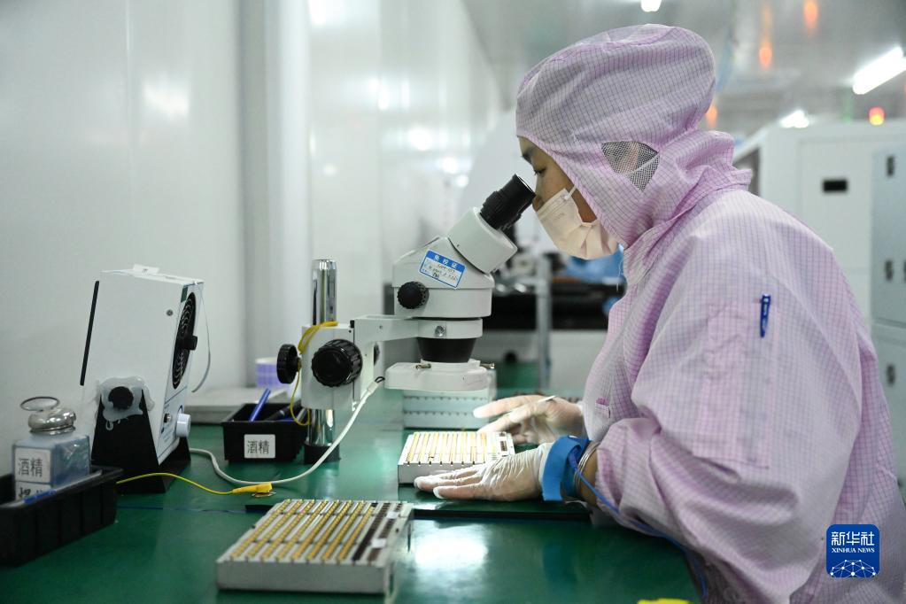 4月12日,在福建泉州石獅市的一家光芯片生產企業,技術工人在車間里忙碌。