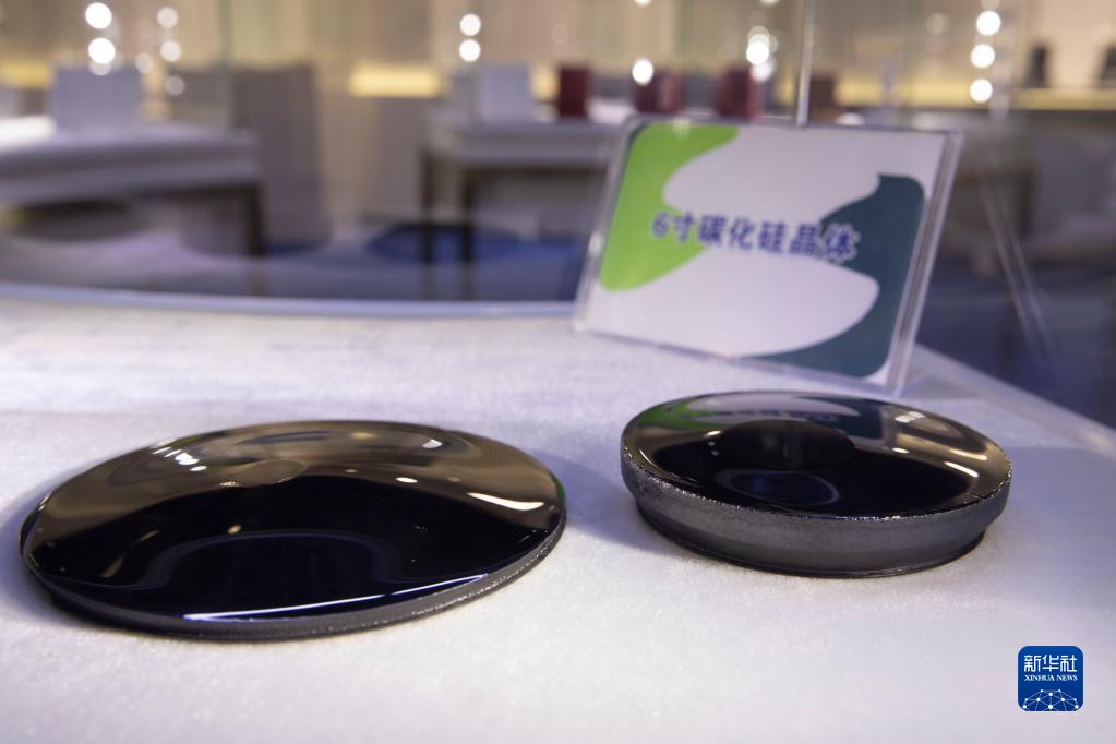 4月24日,在哈爾濱科友半導體產業裝備與技術研究院有限公司展廳內展示的6寸碳化硅晶體。