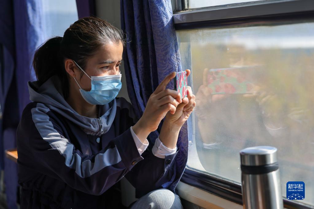 在開往烏魯木齊方向的“和田玉龍號”列車上,乘客在拍攝沿途風景(4月29日攝)。