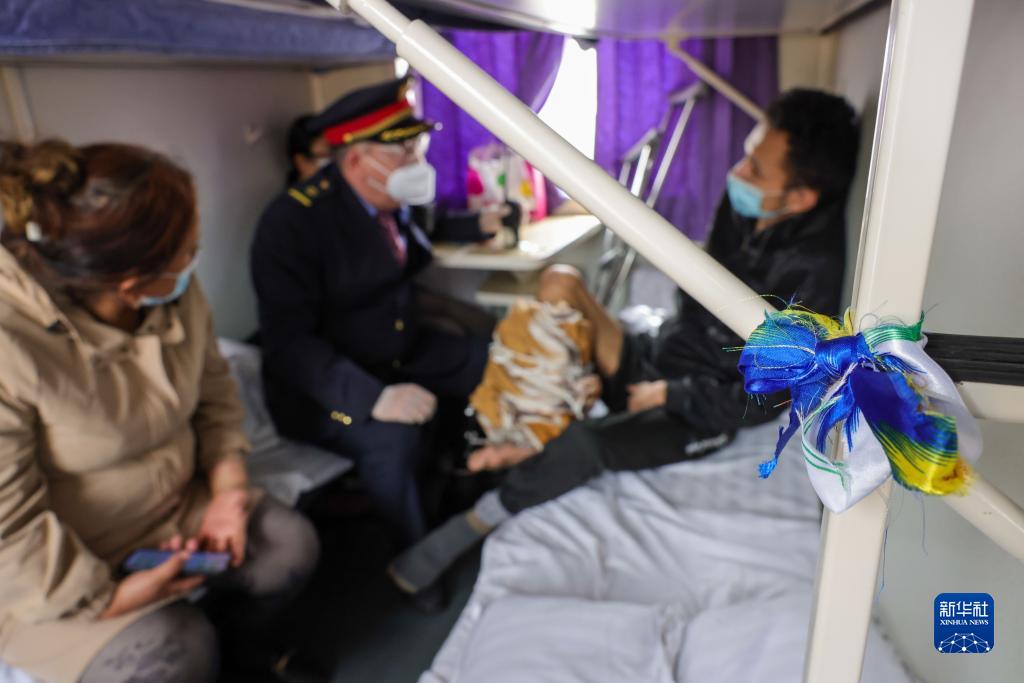 在開往和田方向的“和田玉龍號”列車上,列車長坡拉提汗詢問特殊重點旅客身體狀況(4月27日攝)。列車員會在每一位特殊重點旅客座位上做標記,方便為其服務。