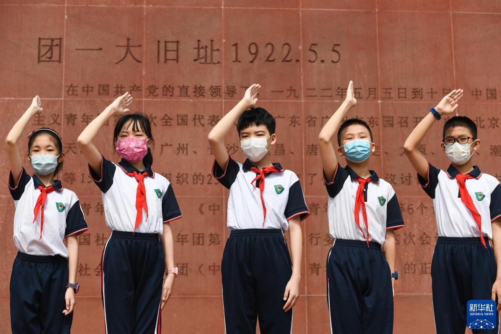 5月4日,少先隊員在團一大廣場進行紅色打卡。