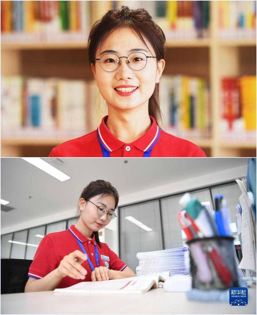 拼版照片:上圖為雄安容和德輝學校教師袁子薇(4月26日攝);下圖為袁子薇在雄安容和德輝學校辦公室備課(4月26日攝)。