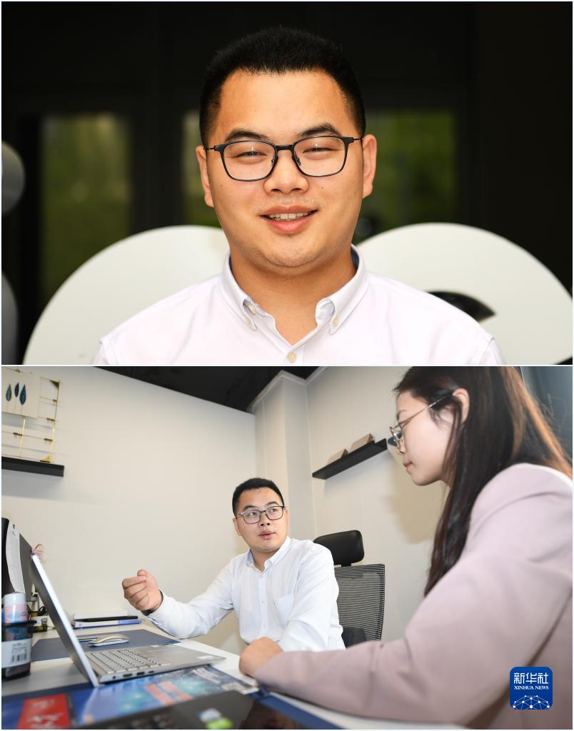 拼版照片:上圖為雄安新區黨群工作部人才工作組組長唐普亮(4月21日攝);下圖為唐普亮在雄安市民服務中心辦公室與同事交流(4月21日攝)。