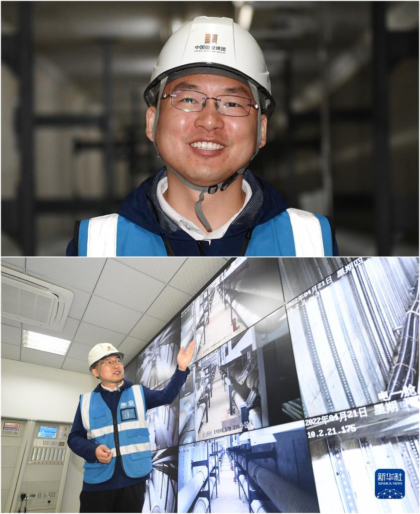 拼版照片:上圖為中國雄安集團基礎建設公司業務經理張偉元(4月21日攝);下圖為張偉元在雄安容東地下管廊監控室工作(4月21日攝)。