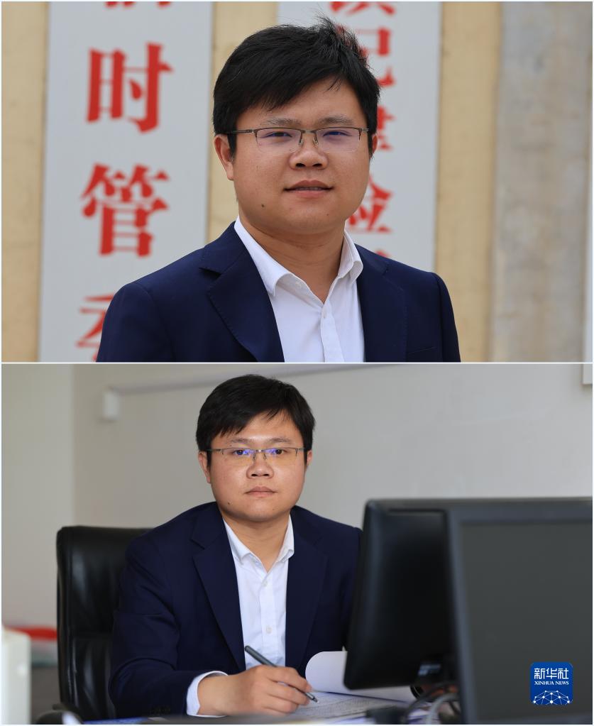 拼版照片:上圖為雄安新區容城縣大河鎮黨委副書記曲吉星(4月27日攝);下圖為曲吉星在容城縣大河鎮黨委辦公室工作(4月27日攝)。
