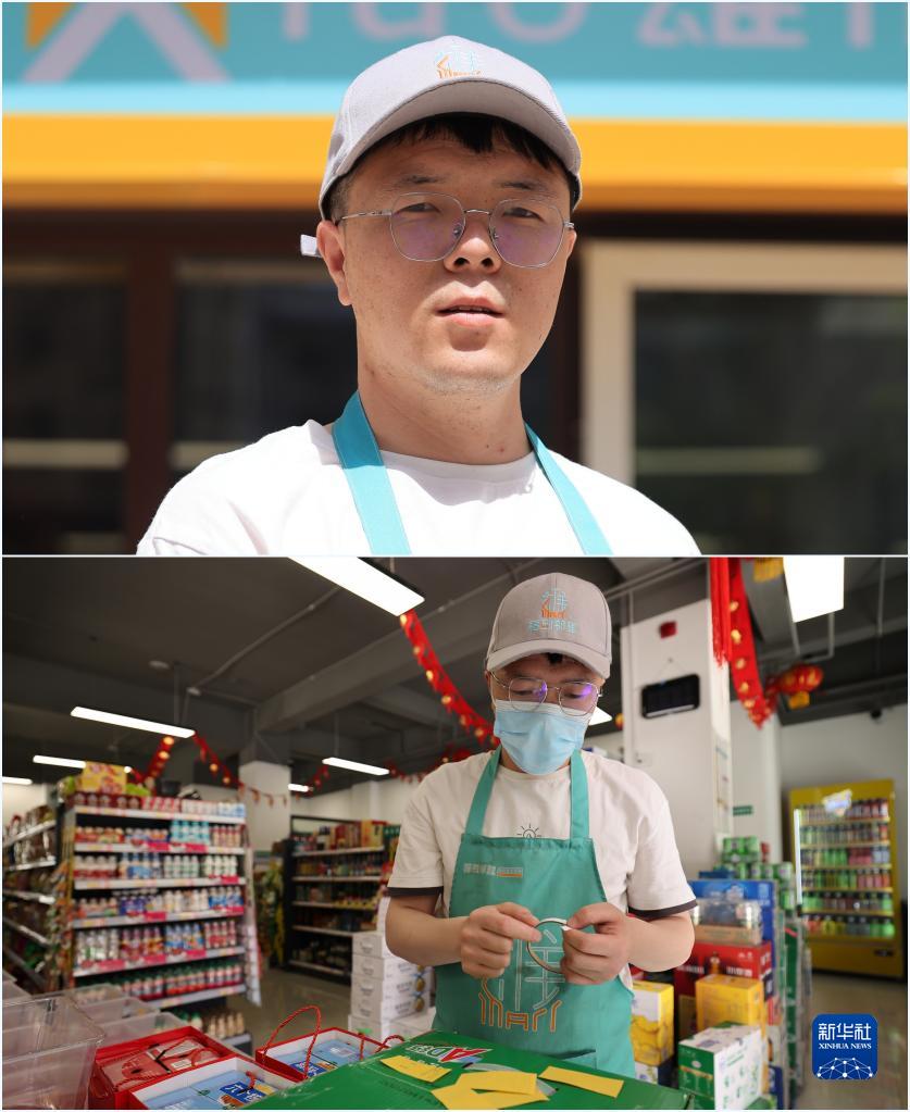 拼版照片:上圖為雄安容東片區“xiao雄mall”便利店店長趙王金(4月26日攝);下圖為趙王金在便利店內工作(4月26日攝)。