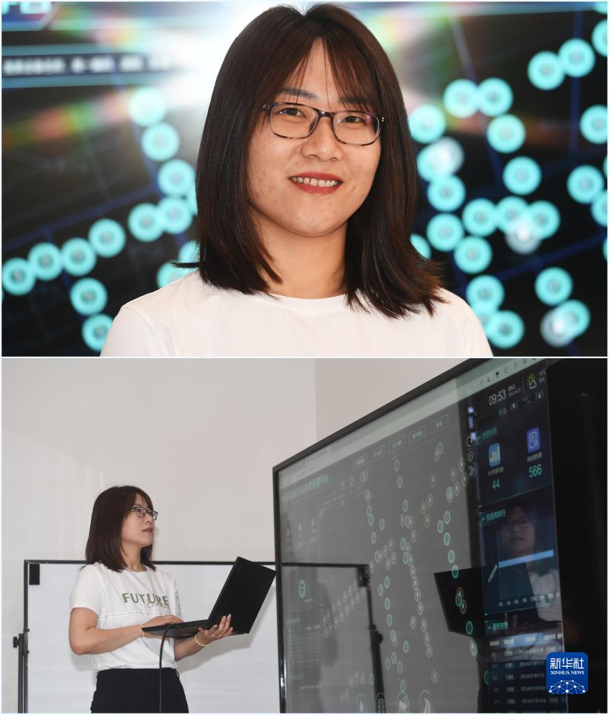 拼版照片:上圖為雄安中電信數字城市科技有限公司工程師許婷婷(4月27日攝);下圖為許婷婷在公司數字道路實驗室工作(4月27日攝)。