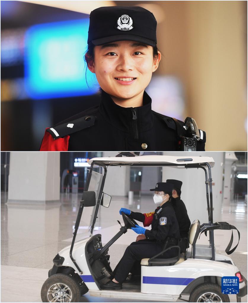 拼版照片:上圖為石家莊鐵路公安處雄安站派出所民警孫明明(4月28日攝);下圖為孫明明在雄安站候車大廳巡邏(4月28日攝)。