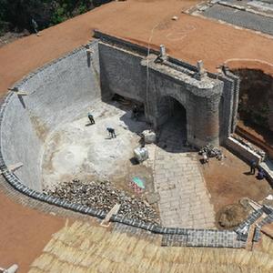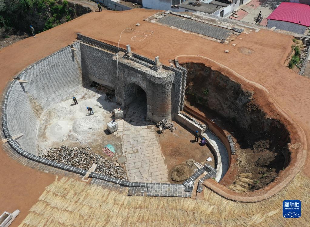 5月7日,工人在秦皇島市盧龍縣城的明代永平府城墻西門甕城修繕工程現場施工(無人機照片)。