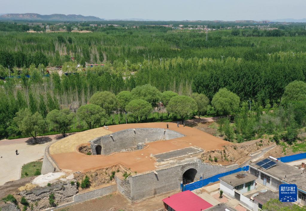 5月7日,工人在秦皇島市盧龍縣城的明代永平府城墻西門甕城修繕工程現場施工(無人機照片)。