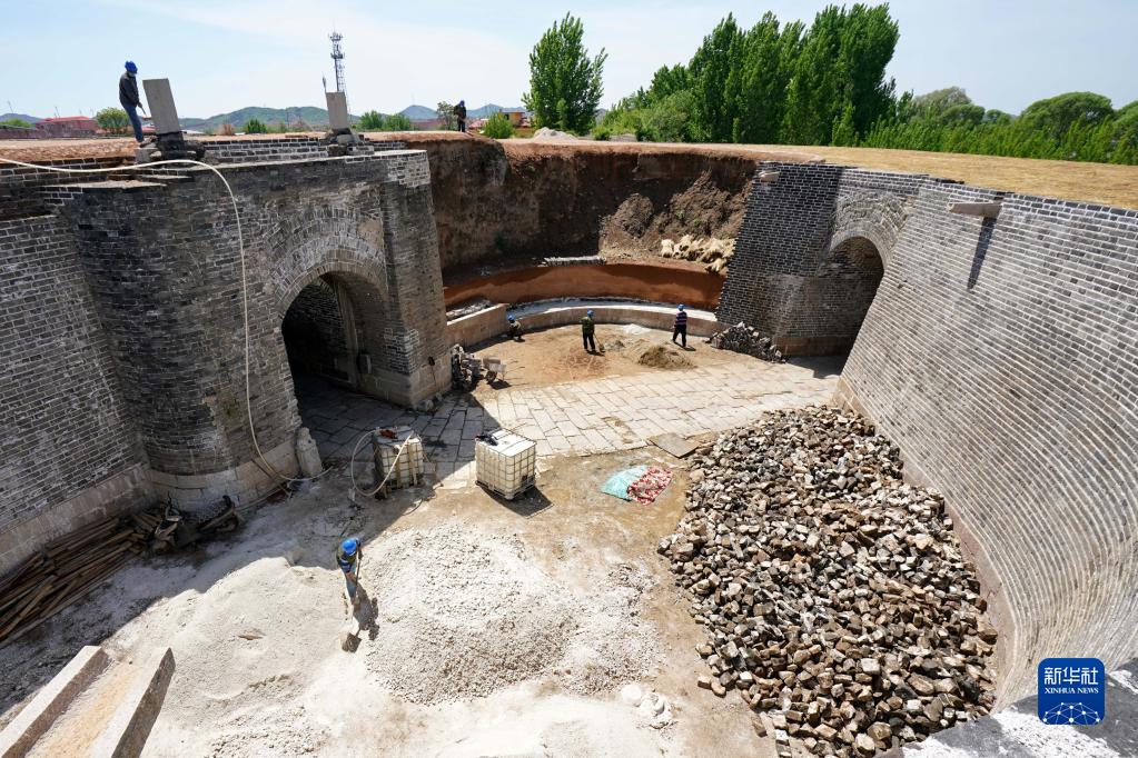 5月7日,工人在秦皇島市盧龍縣城的明代永平府城墻西門甕城修繕工程現場施工。