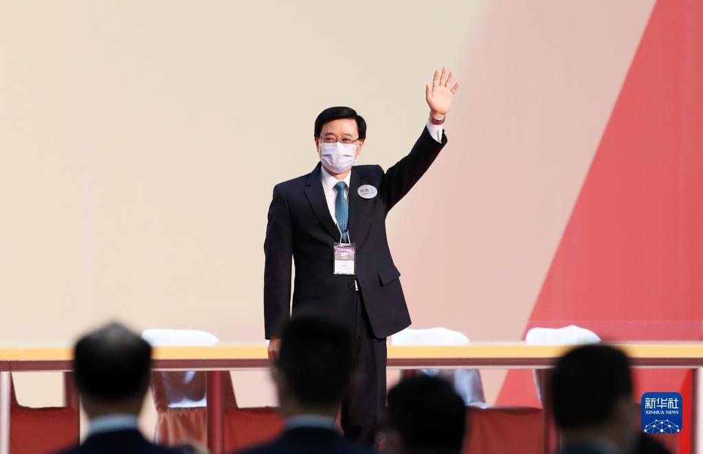5月8日,在香港會議展覽中心,李家超揮手致意。