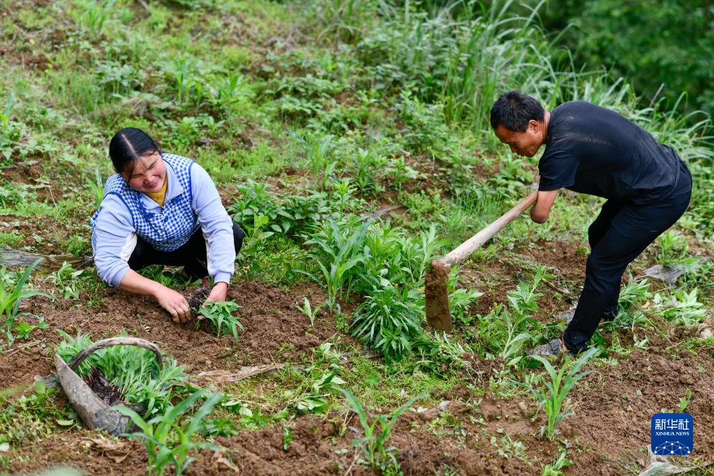 趙友良與妻子簡琴在移栽玉米苗(5月12日攝)。