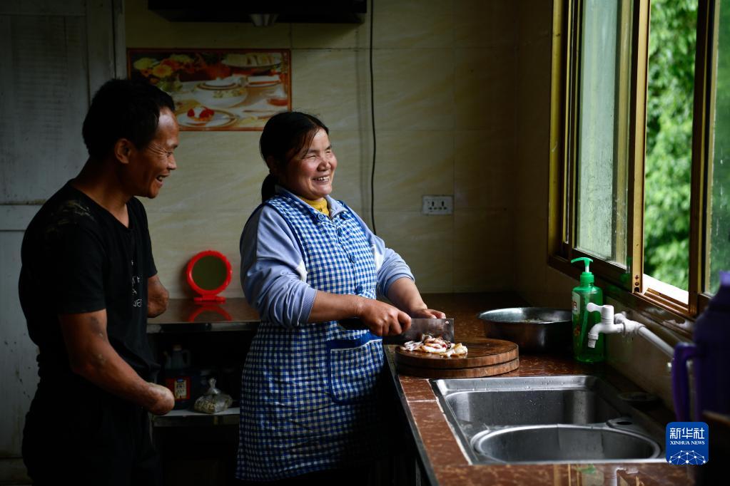 簡琴在家里切菜準備做飯,趙友良在旁邊陪著妻子聊天(5月12日攝)。