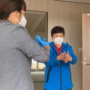 胡鷹鷹(右一)在同濟大學附屬上海第四人民醫院協助即將上班的隊員穿防護服(5月13日攝)。