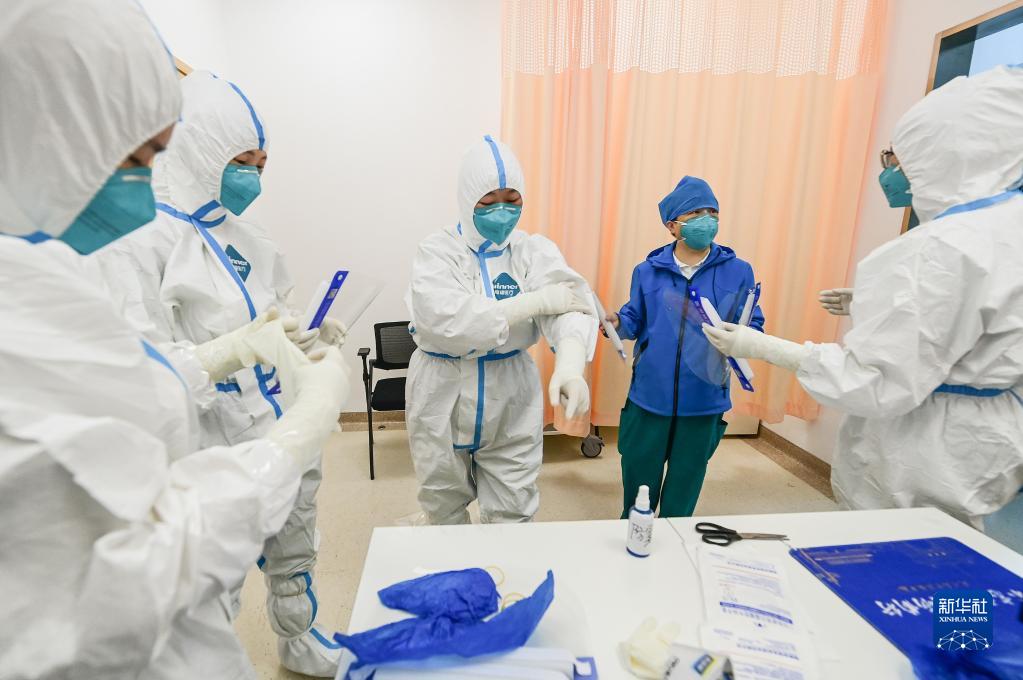 在同濟大學附屬上海第四人民醫院防護服穿戴區,胡鷹鷹(右二)監督指導醫療隊員穿防護服(5月13日攝)。