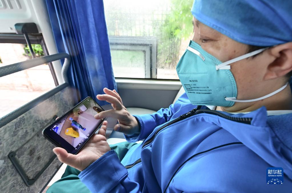 胡鷹鷹在大巴車上通過手機實時監看醫院“脫衣區”情況(5月13日攝)。