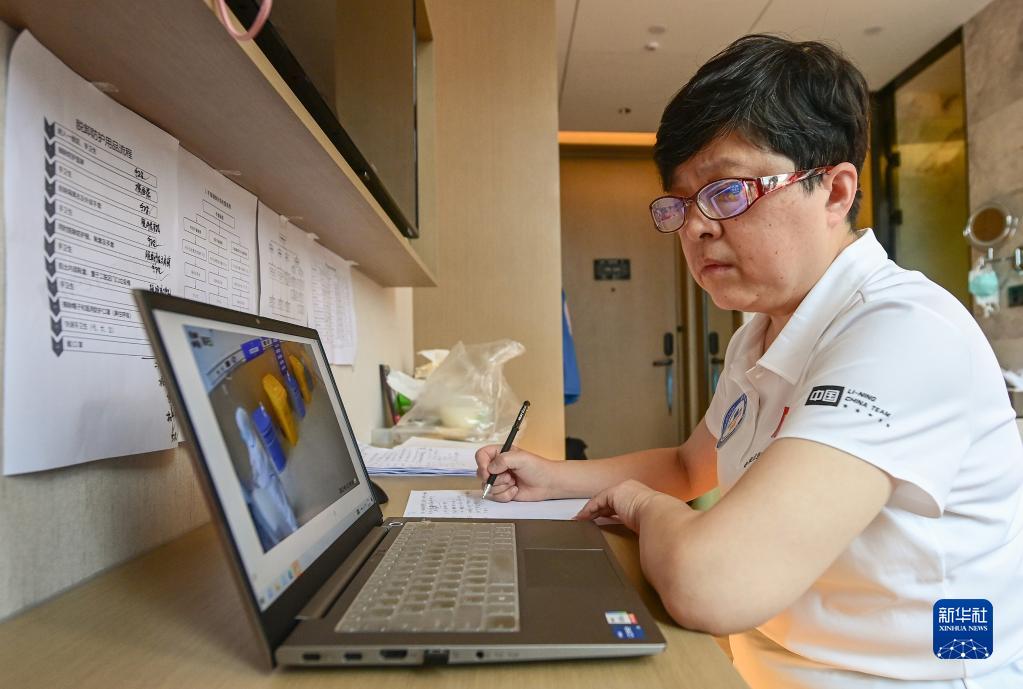回到住地房間后,胡鷹鷹在電腦上回看監控記錄并整理院感控制動態報告(5月13日攝)。