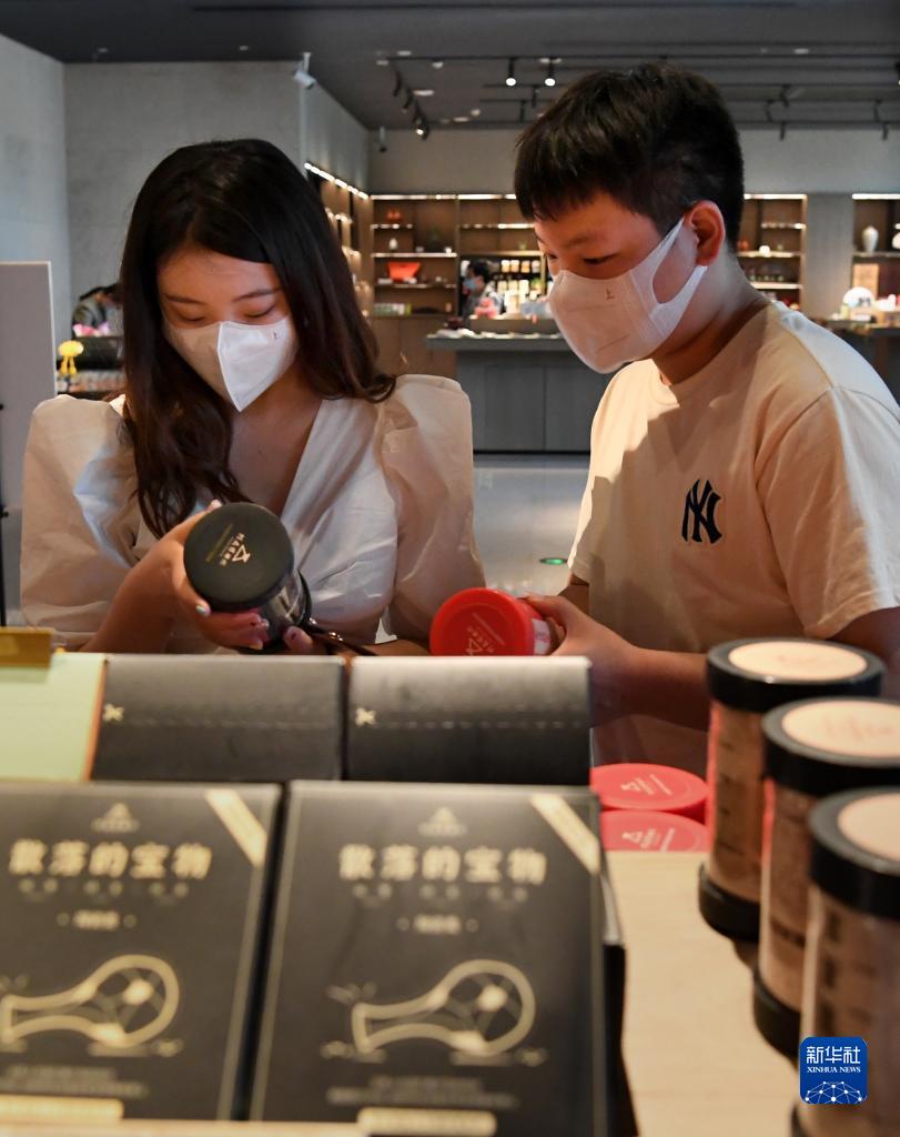 5月17日,兩位參觀者在河南博物院文創商店內挑選考古盲盒。