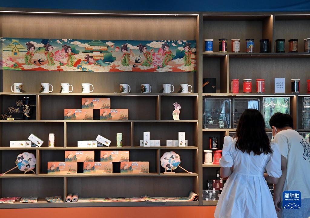 5月17日,兩位參觀者在河南博物院文創商店內挑選文創產品。