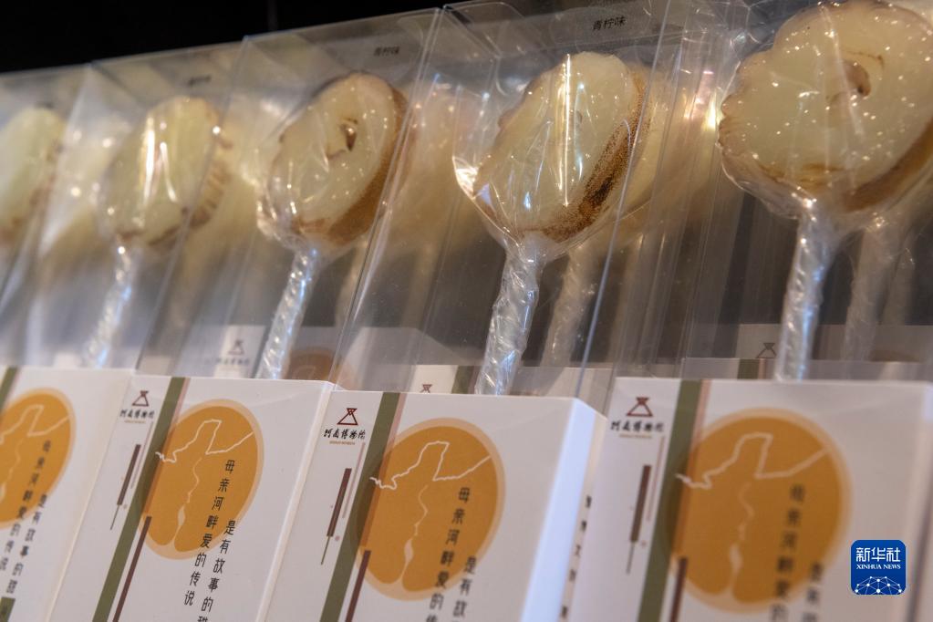 這是在河南博物院文創商店拍攝的以“青玉人首蛇身飾”為原型的玉佩棒棒糖(5月17日攝)。