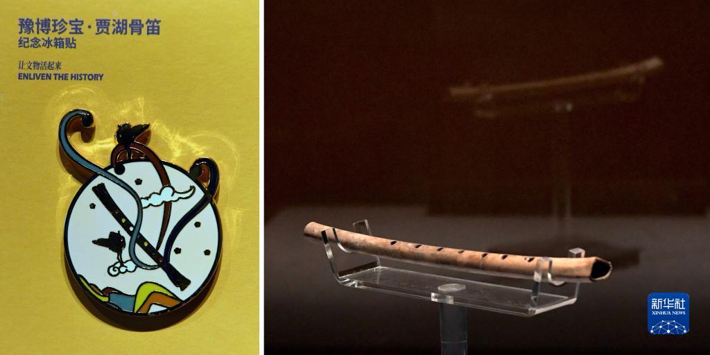 拼版照片:左圖為河南博物院推出的“賈湖骨笛”冰箱貼;右圖為河南博物院展出的展品“賈湖骨笛”(5月17日攝)。