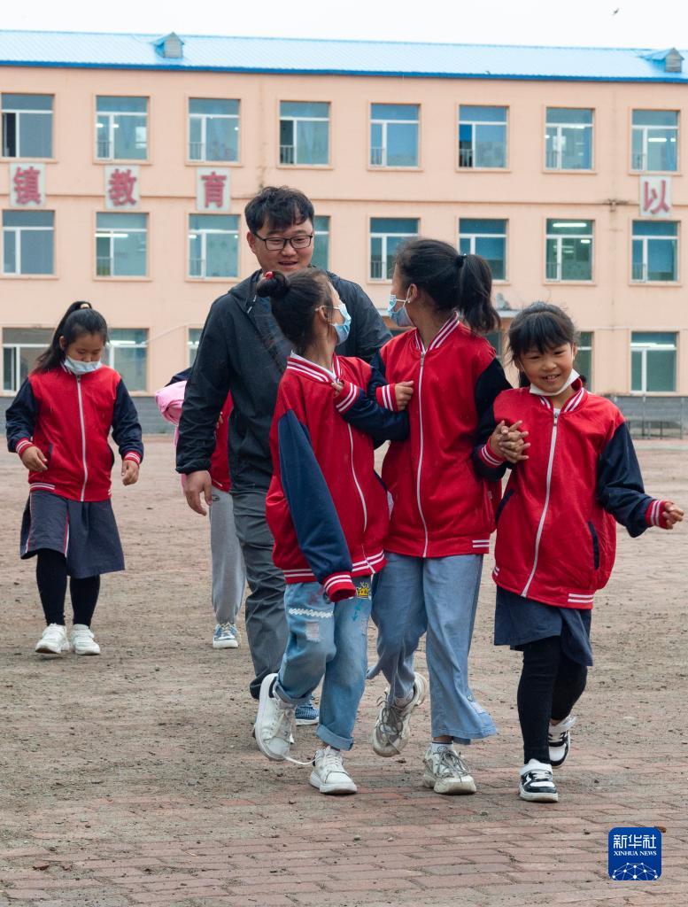 5月24日,在黑龍江省安達市任民鎮中心小學校園內,張雨(左二)和“村里的孩兒”音樂班的孩子走向音樂教室。