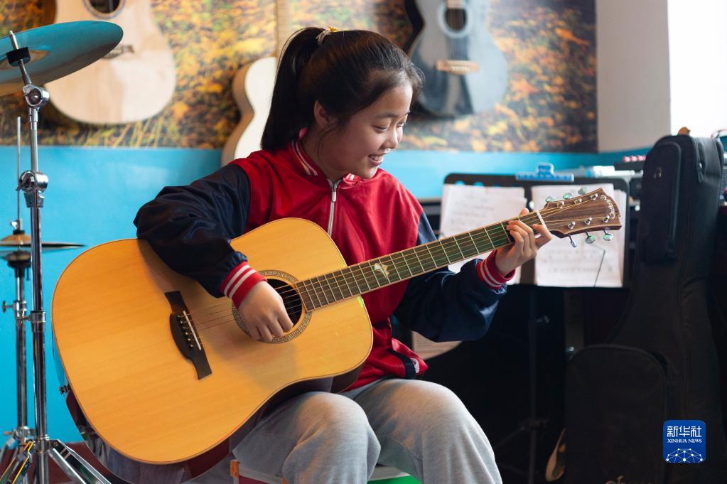 5月24日,在黑龍江省安達市任民鎮中心小學,“村里的孩兒”音樂班的孩子進行樂隊排練時露出笑容。
