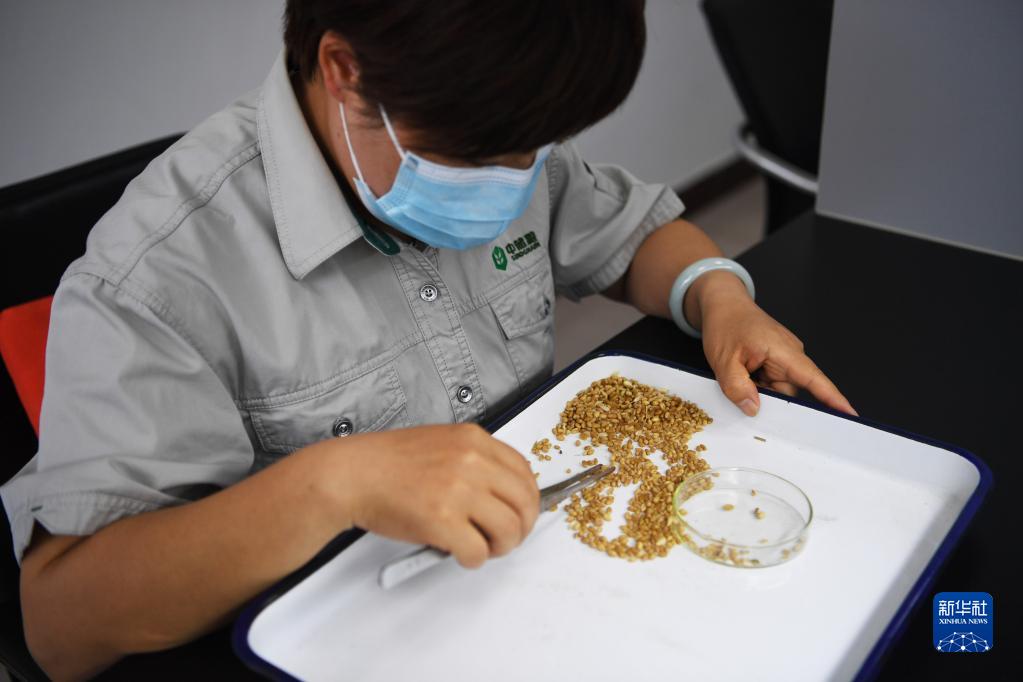 5月24日,在中央儲備糧鄧州直屬庫有限公司質檢室內,質檢員挑揀小麥不完善粒。