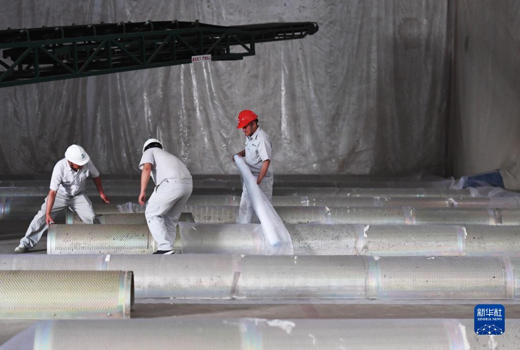5月24日,在中央儲備糧鄧州直屬庫有限公司騰出的糧庫內,工作人員檢查地上通風籠和防漏網鋪設情況。