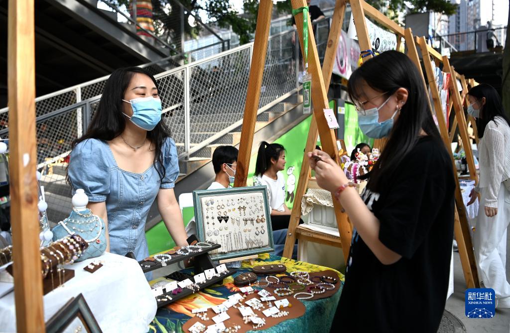 市民在西安際華3511文創科技園內的市集上挑選飾品(5月20日攝)。