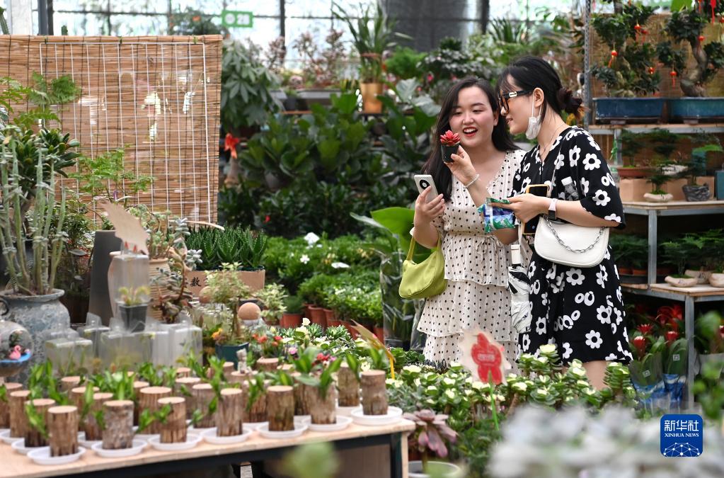 市民在西安際華3511文創科技園內的花市挑選花卉(5月20日攝)。