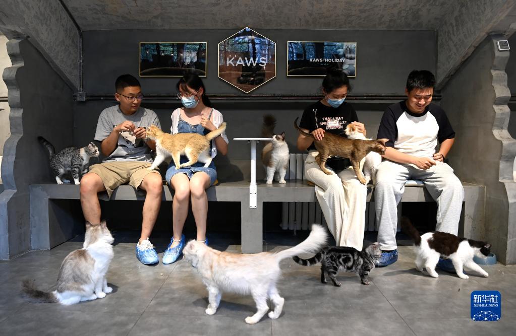 市民在西安際華3511文創科技園內的貓咖逗貓(5月20日攝)。