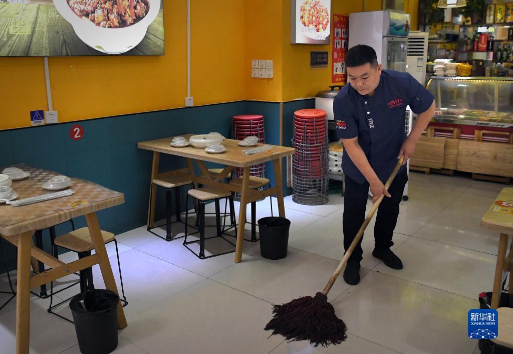 張占領在位于鄭州市二七區的店鋪內打掃衛生(5月31日攝)。
