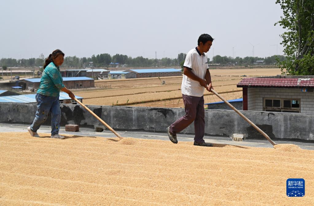 6月7日,在衛輝市劉板橋村,劉建儒(右)和牛玉蘋在晾曬新麥。