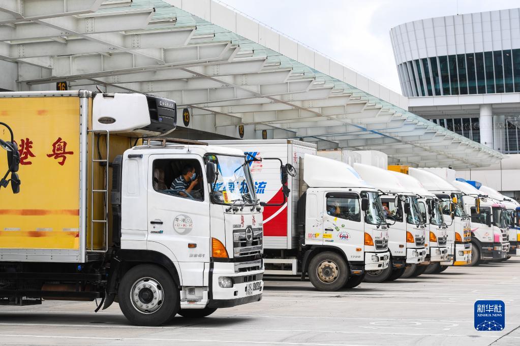 疫情期間,從深圳蓮塘口岸入境的跨境貨車在口岸進行閉環管理(6月17日攝)。