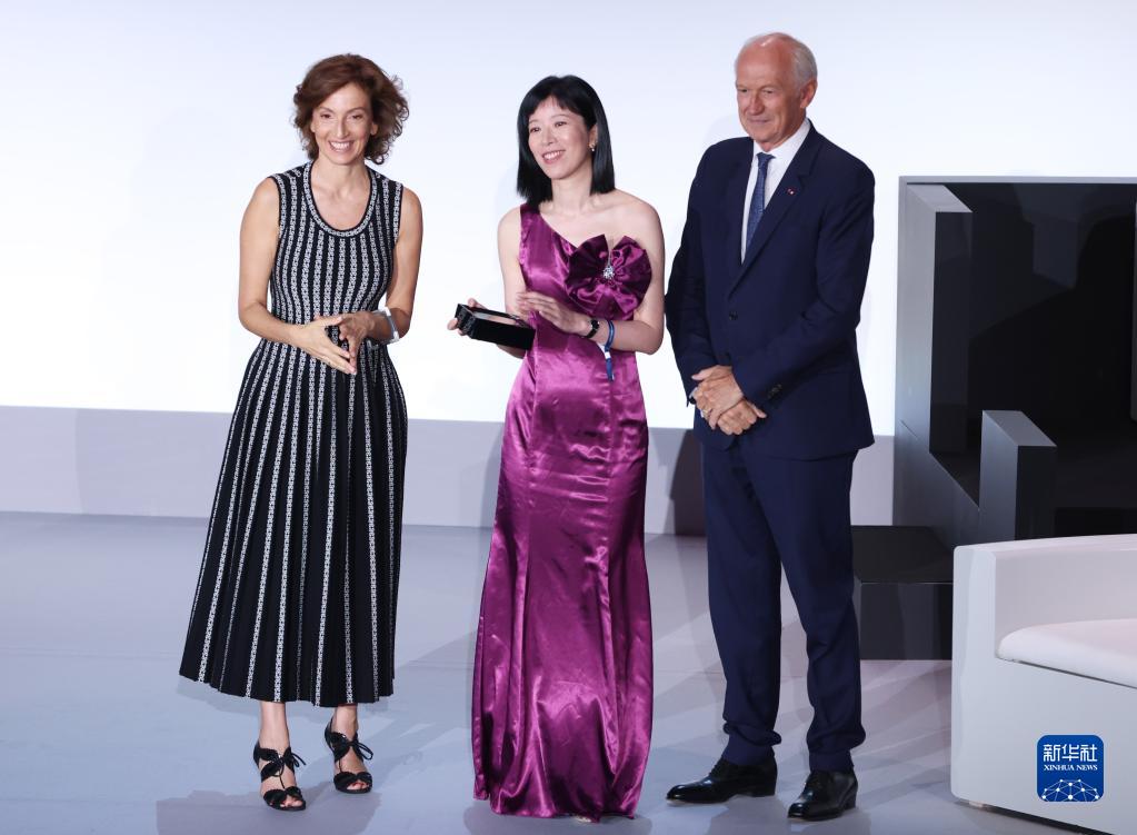6月23日,在位于法國巴黎的聯合國教科文總部,胡海嵐(中)獲頒“世界杰出女科學家獎”。