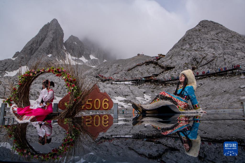 6月26日,游客在玉龍雪山景區拍照留念。