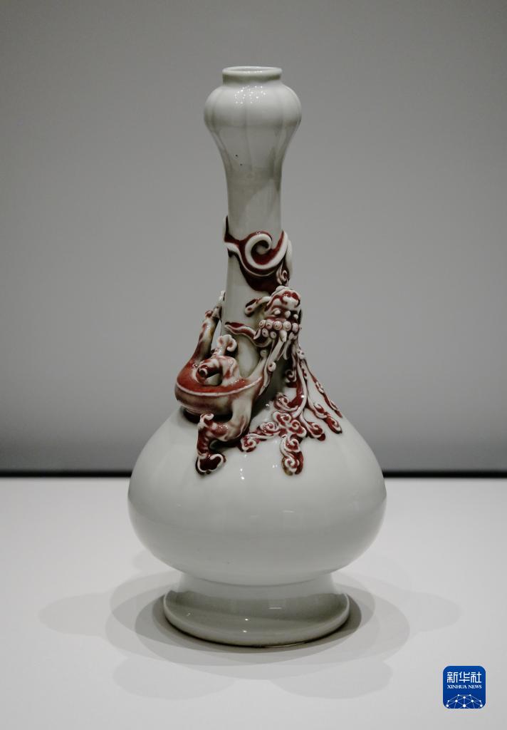6月28日在香港故宮文化博物館拍攝的明代白釉塑貼鮮紅釉蟠螭蒜頭瓶。
