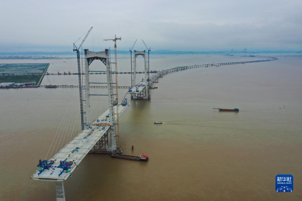 建設中的深中通道中山大橋(5月15日攝,無人機照片)。深中通道全長24公里,集橋、島、隧、地下互通為一體,連接珠江口東西兩岸的深圳市和中山市,預計2024年建成通車。
