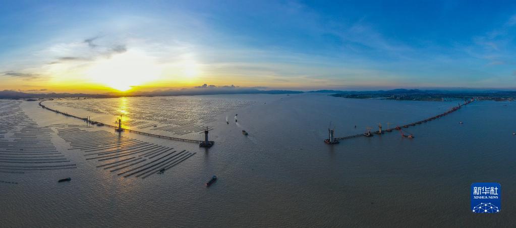 建設中的黃茅??绾Mǖ溃?月27日攝,無人機全景照片)。黃茅??绾Mǖ罇|起珠海市平沙鎮,西接江門市斗山鎮,橫跨珠江口崖門入??邳S茅海水域,線路全長約31公里,預計2024年建成通車。